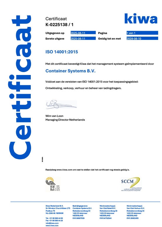 Met trots kondigen wij aan dat Van Vliet Containers officieel is erkend met het ISO 9001 en ISO 14001 certificaat, toegekend door KIWA. Deze certificeringen bevestigen dat onze organisatie niet alleen werkt volgens de hoogste kwaliteitsnormen, maar ook bewust en verantwoordelijk omgaat met het milieu.